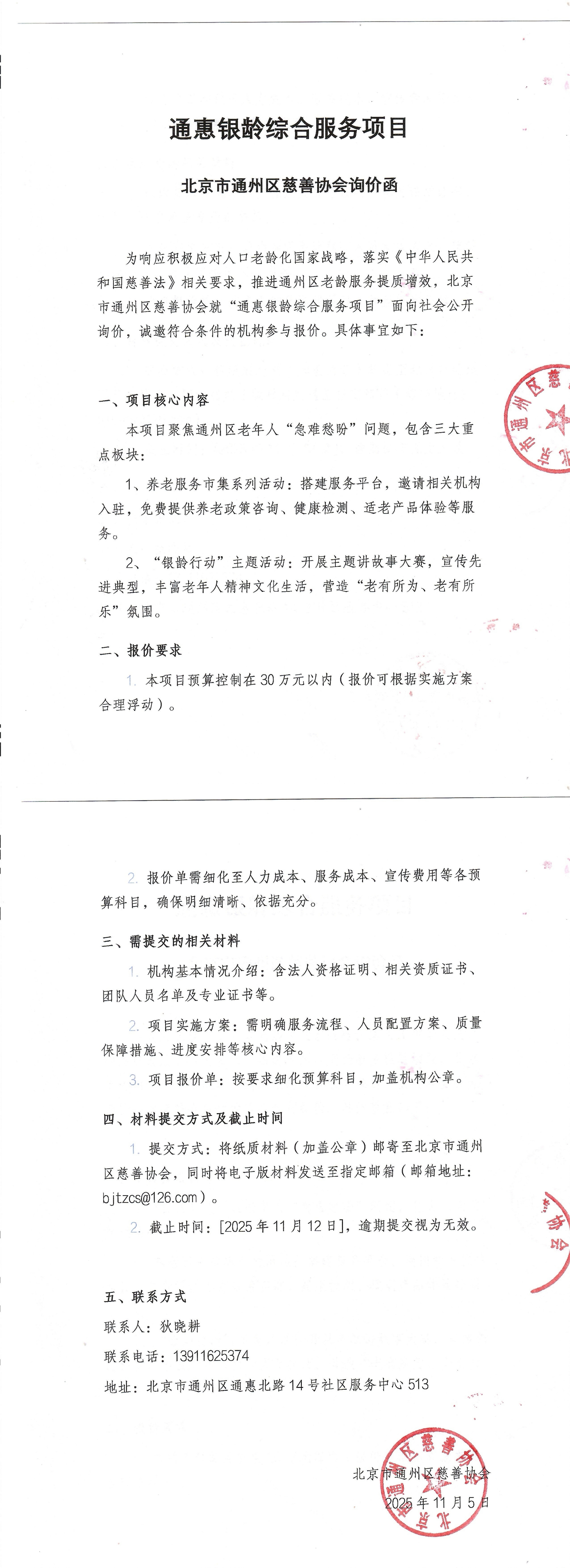为响应积极应对人口老龄化国家战略,落实《中华人民共和国慈善法》相关要求,推进通州区老龄服务提质增效,北京市通州区慈善协会就“通惠银龄综合服务项目”面向社会公开询价,诚邀符合条件的机构参与报价。具体事宜如下: